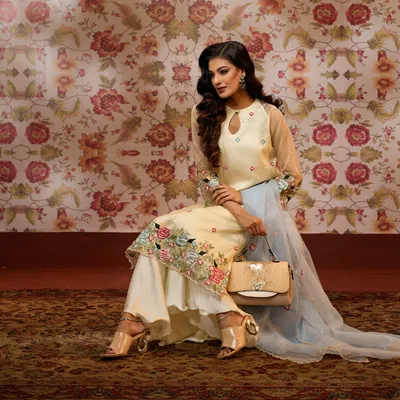 Kameez Material: MaslinDupatta Material: Silk Organza Salwar Material: Soft Silk Design: Karchupi & Embroidery Available Size: L (chest-40; can bealtered upto 42)