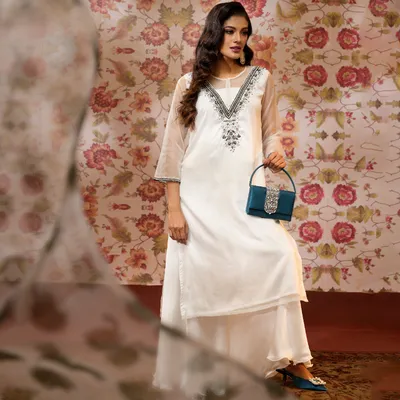 Kameez Material: MaslinDupatta Material: Silk Organza Salwar Material: Soft Silk Design: Karchupi & Embroidery Available Size: L (chest-40; can bealtered upto 42)